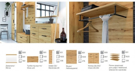 Якщо ви хочете модно й елегантно обставити свою передпокій, виберіть шафа Фокус, пропонування від виробника Сокме. Дизайн меблів ґрунтується на простій формі, зручній і ефективній ручці та практично закінченому інтер'єрі. В шафі ви знайдете полицю та місце для вішалок. У шафі Фокус також використовується практичне дзеркало, яке освітлює й оптично збільшує передпокій, а також модні та дуже популярні в сучасному інтер'єрі кольору дуба Артизан.